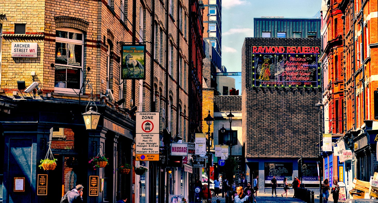 Let’s start here, just outside 132 Charing Cross Road, on the corner with Denmark Street, just down from Tottenham Court Road tube. Let’s cross the road - now mind those cars and watch out for the e-bikes. Let’s nip down Manette Street, past the little Orthodox chapel, under the Pillars of Hercules, and hang a right up Greek Street. Still with us? Good.